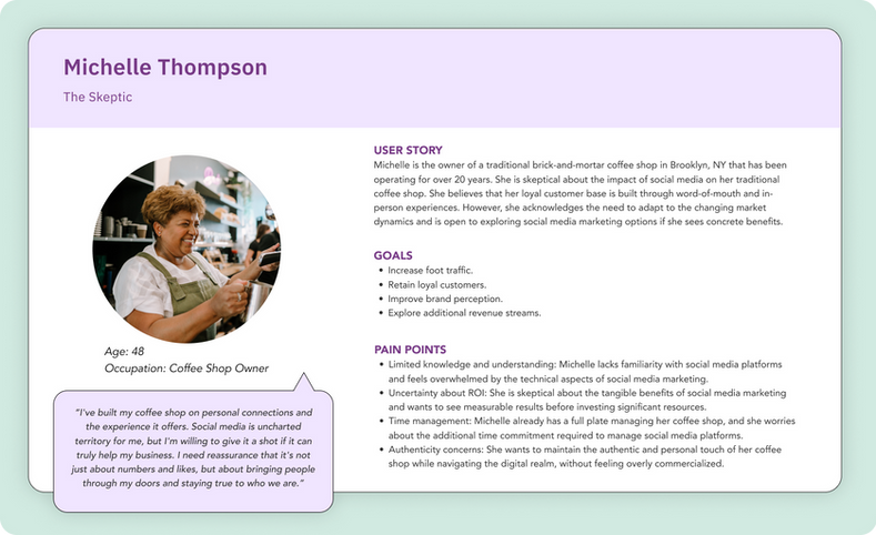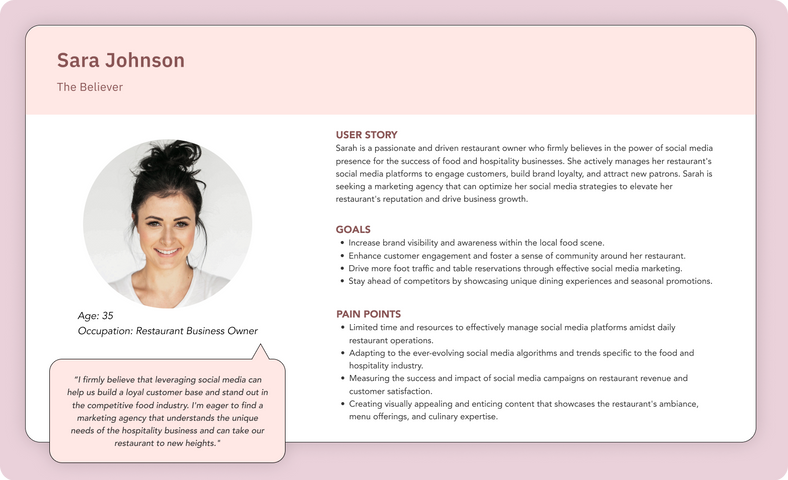 Based on MK Socials’ past and current clients, I’ve defined two personas. Meet Michelle and Sara! They are both business owners within the food and hospitality industry and both potential clients for MK Socials. However, they have different needs, desires and pain points related to digital marketing.